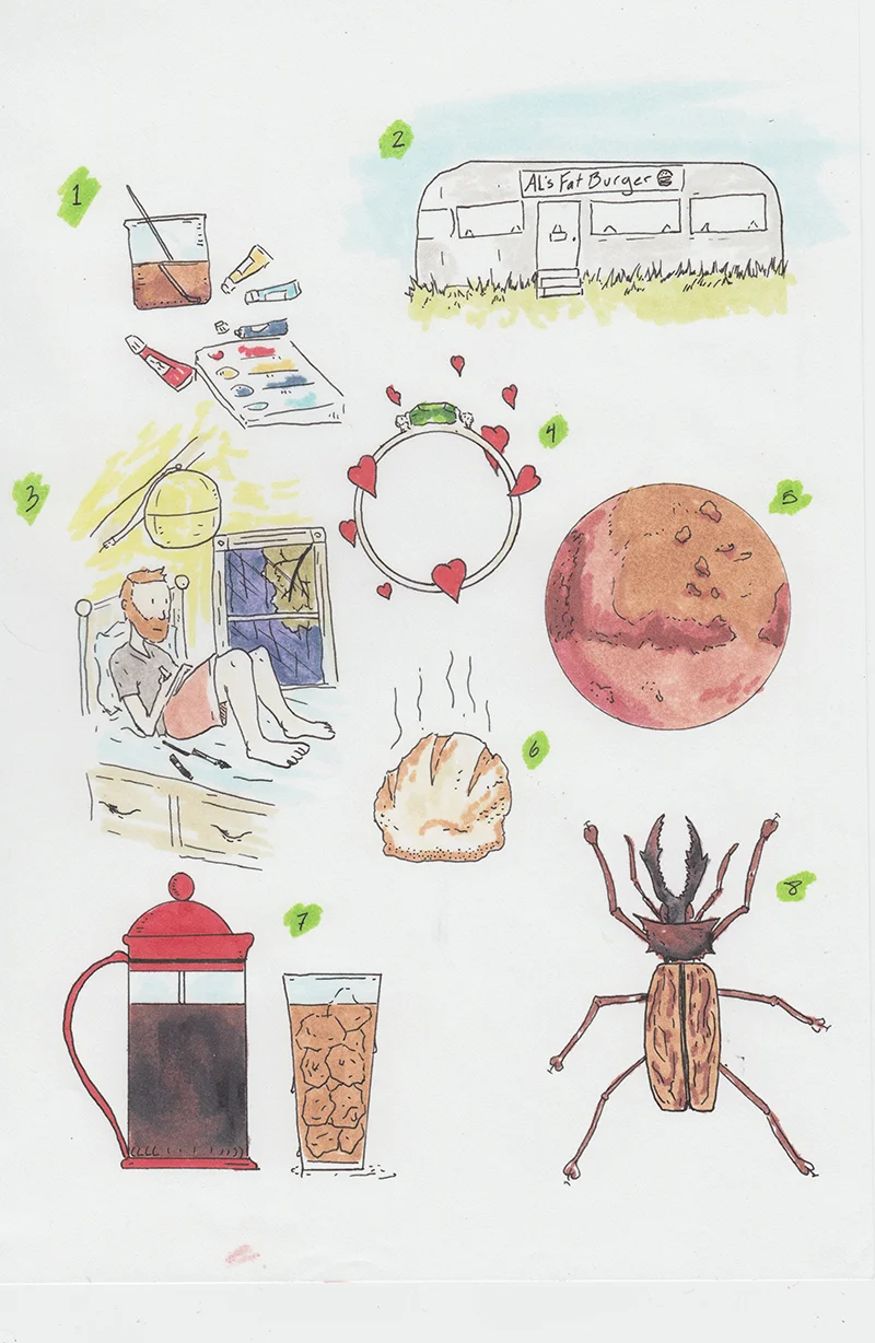 All this comes from Ennis and I keeping a 'happy things' journal on and off for the last couple of years. The idea is to write down some things every day that made you happy. It helps you see the good in every day and keep your spirits up on the bad ones. Also Fran Meneses over here has been doing the same thing but illustrating it and I borrowed that format because I thought it was totally brilliant!